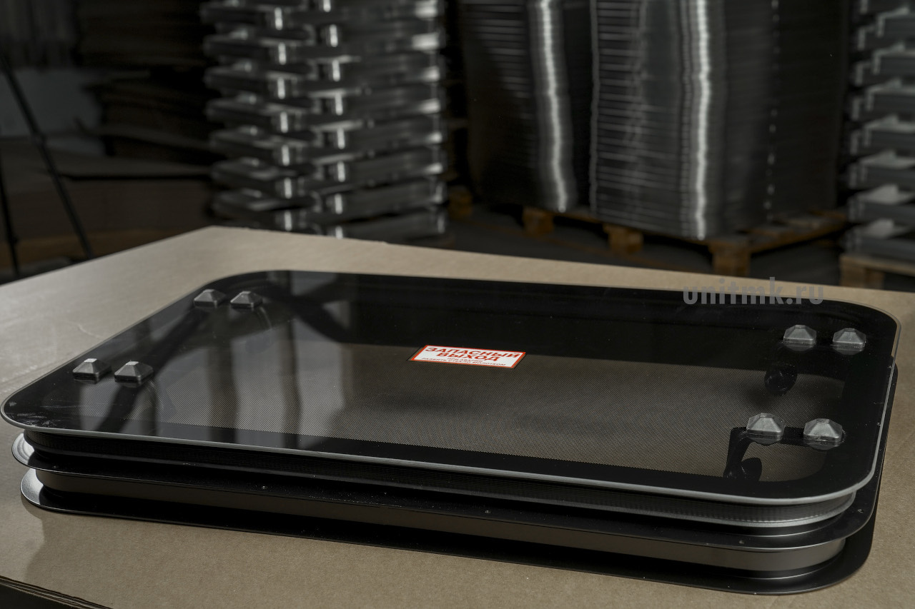 В отверстие люка вписывается прямоугольник размером 50 х 70 см.Фиксирующий механизм люка четко фиксирует крышку люка во всех открытых положениях.В закрытом положении аварийно-вентиляционный люк обеспечивает полную герметичность крыши салона транспортного средства от попадания атмосферных осадков. Температурный режим эксплуатации люка от -45°С до +85°С.Конструкция аварийно-вентиляционного люка полностью ремонтно-пригодна.Крышка люка при аварийном срабатывании полностью удаляется из проема как изнутри, так и снаружи для обеспечения свободного выхода (входа).
